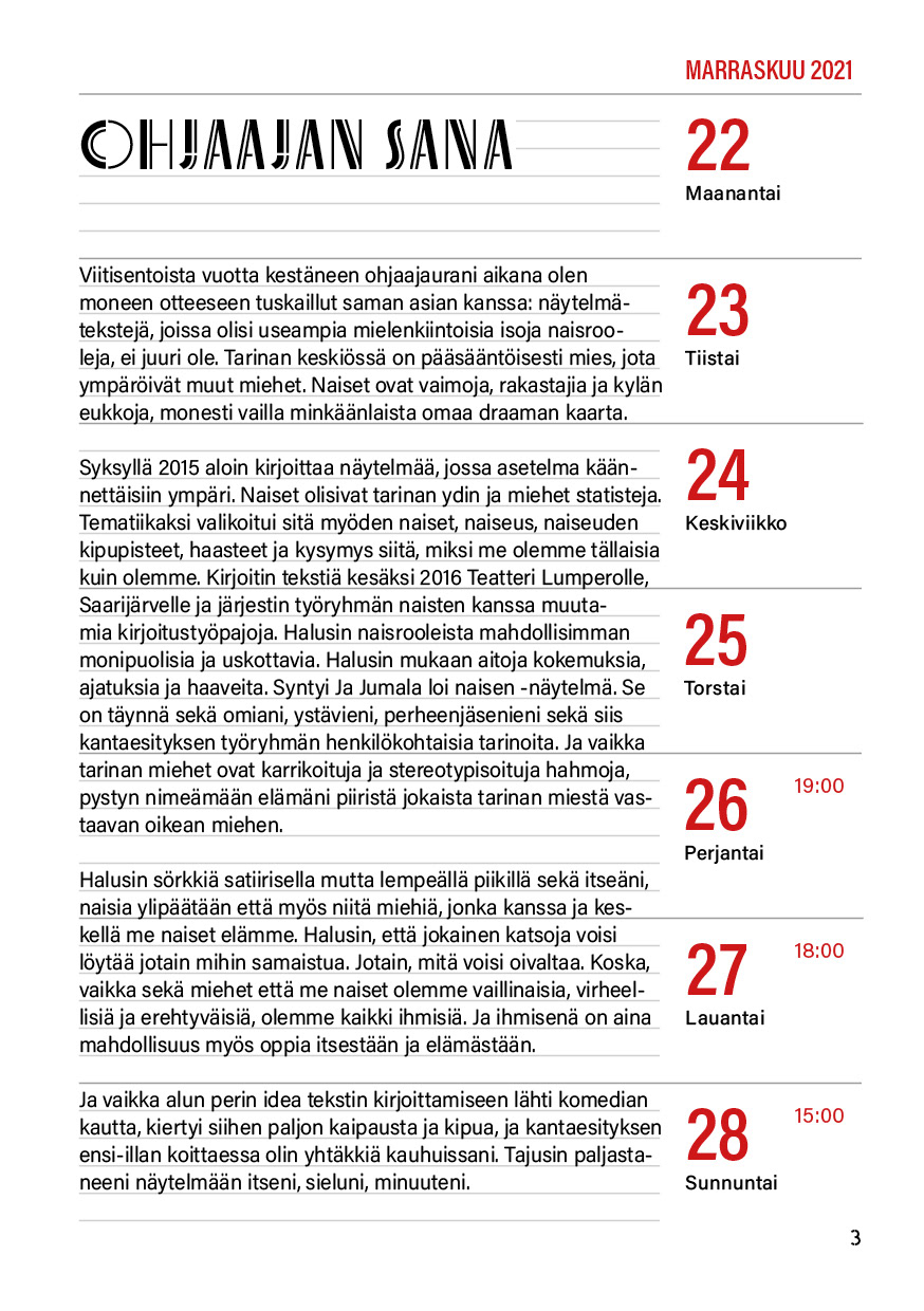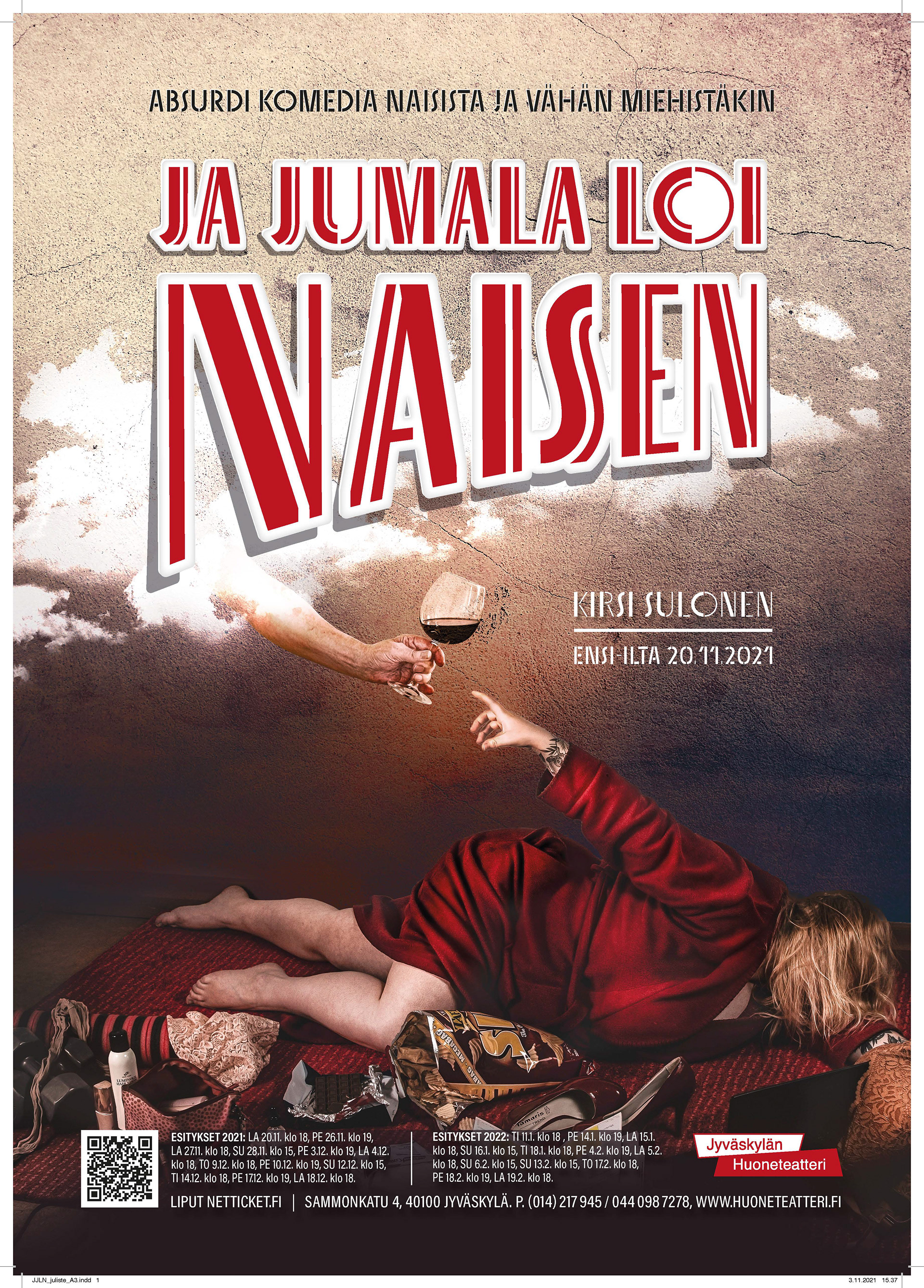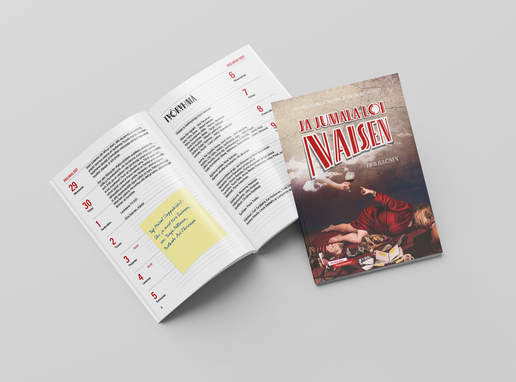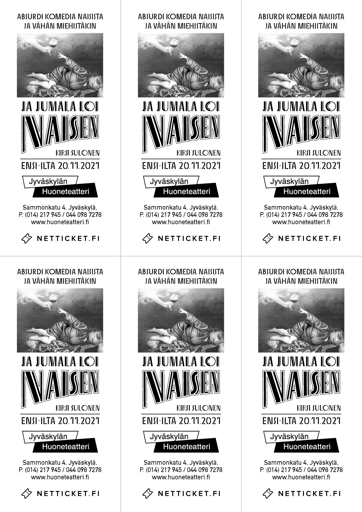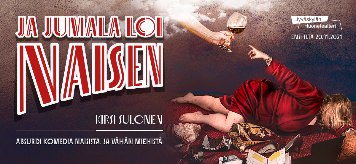 And God Created a Woman is a comedy about women and femininity. The play was written and directed by Kirsi Sulonen. The work: advertising material for the web and print as banners, posters, flyers, and a handbill.